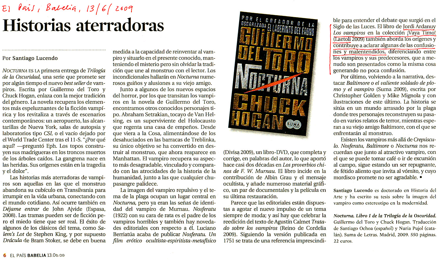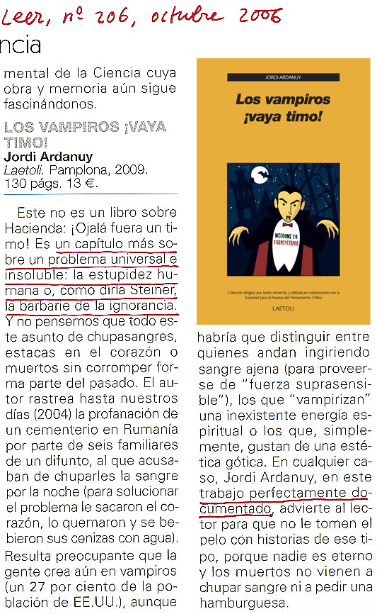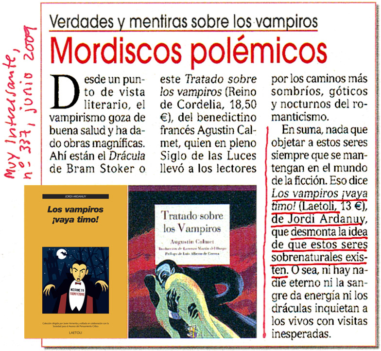 "Nada que objetar a estos seres siempre que se mantengan en el terreno de la ficción. Eso dice Los vampiros ¡vaya timo!, de Jordi Ardanuy, que desmonta la idea de que estos seres sobrenaturales existen. O sea, ni hay nadie eterno ni la sangre da energía ni los dráculas inquietan a los vivos con visitas inesperadas" (Muy Interesante)